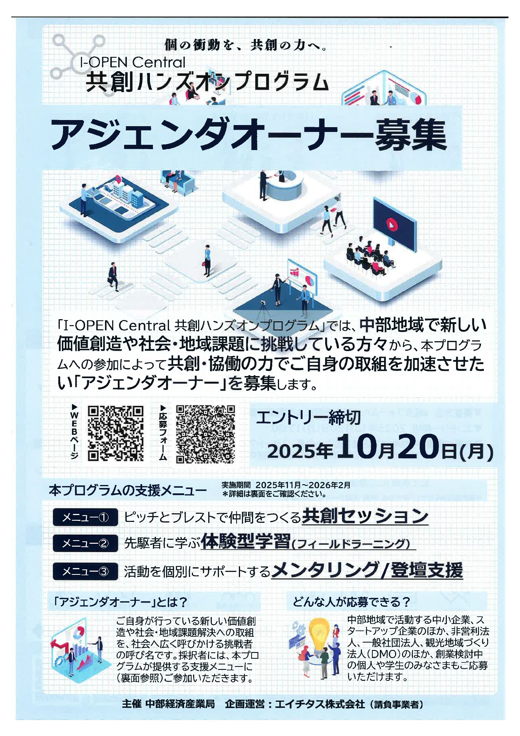 このたび、エイチタス株式会社(委託元:中部経済産業局)では、知財を活用して未来を切りひらく次世代のリーダーを育成するプロジェクト「I-OPEN Central」の取組の一環として、「共創ハンズオンプログラム」の支援対象者を募集いたします。