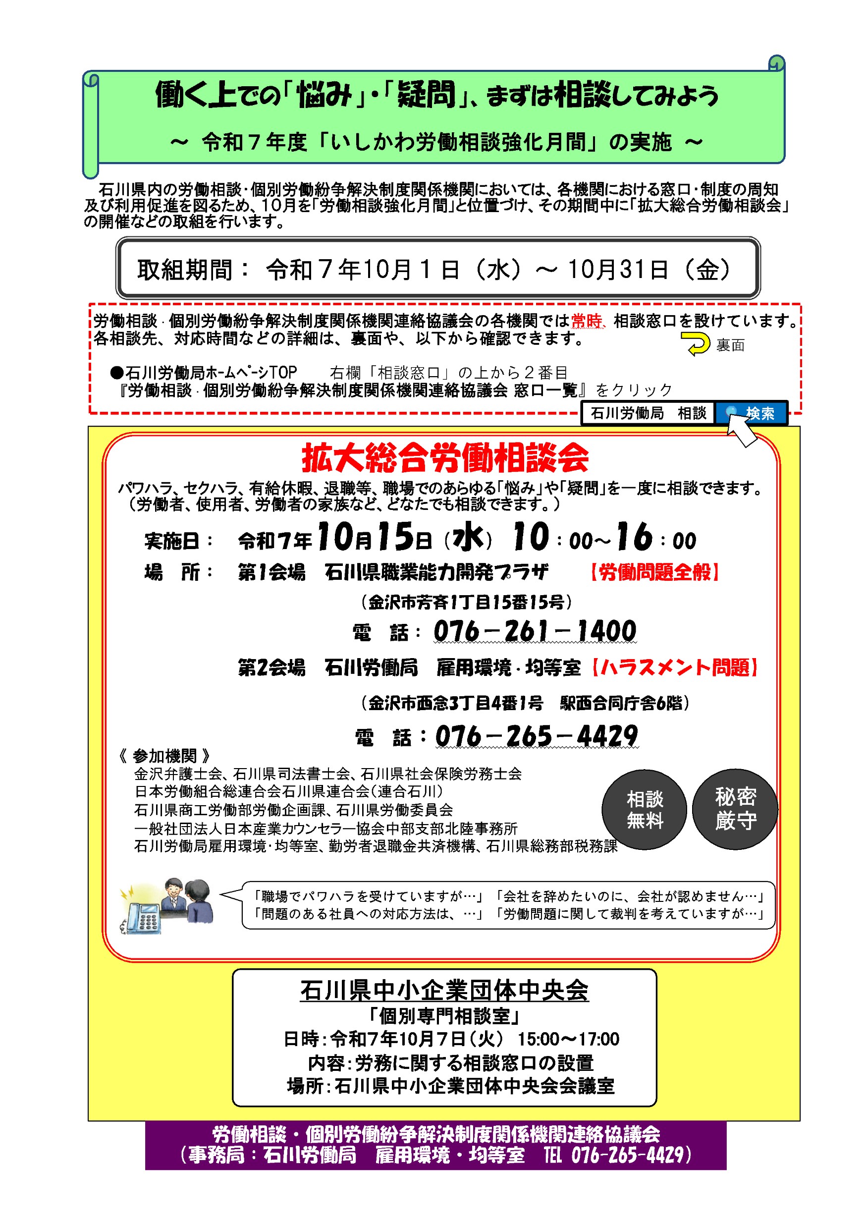 石川労働局 10月の「いしかわ労働相談強化月間」、「拡大総合労働相談会」の周知用リーフレット
